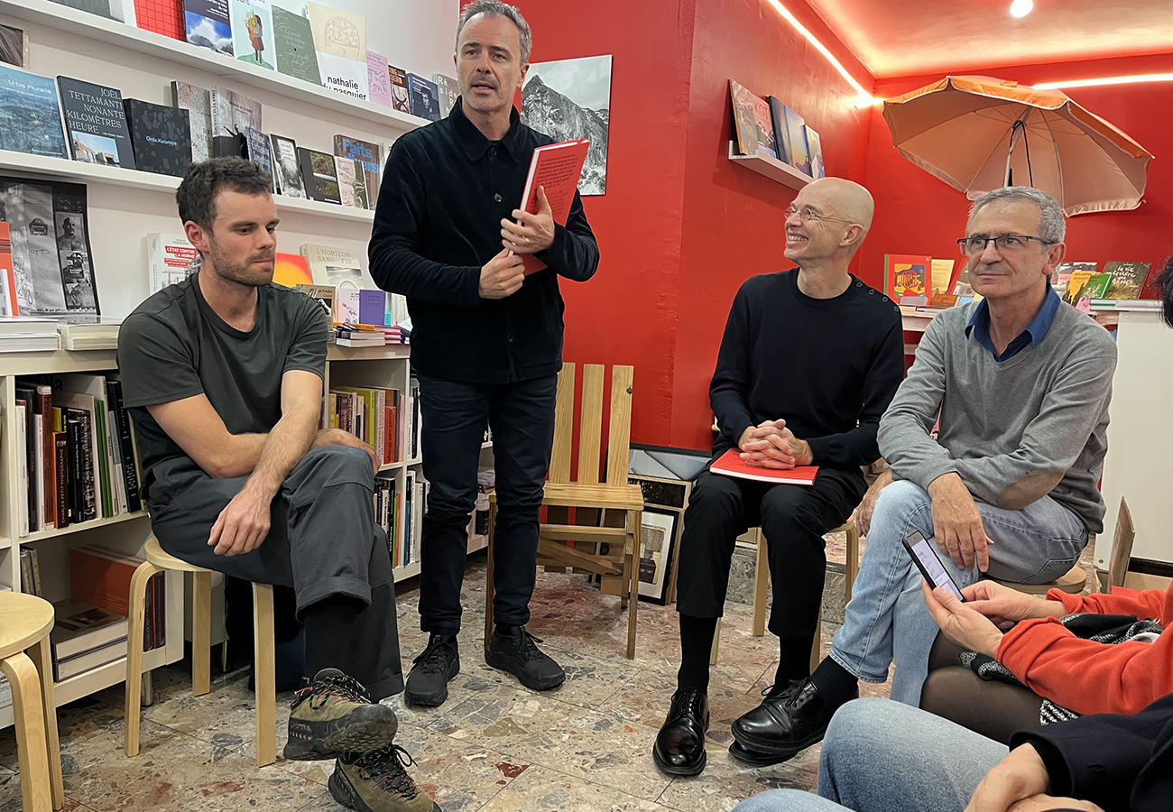 Pierre-Alain Trévelo, Antoine Viger-Kohler et Michel Guthmann présentent l’ouvrage « Ex Materia » à la librairie Volume, en compagnie du photographe Maxime Verret.