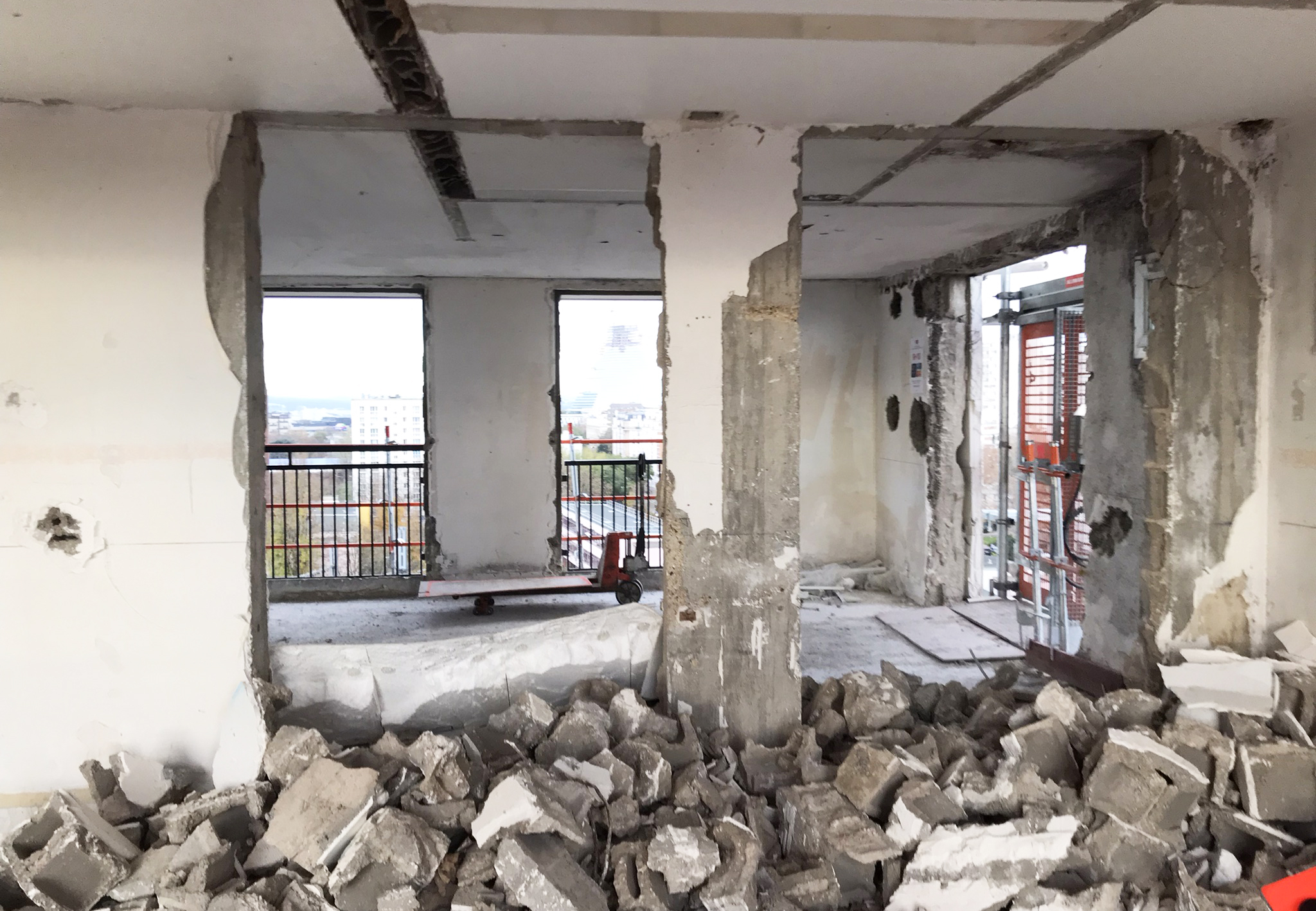 Les premiers percements dans le voile longitudinal central du bâtiment de la Porte de Vanves (Paris 14) préfigurent les transformations à venir, privilégiant un maximum de logements traversants, plus faciles à ventiler et à éclairer naturellement et bénéficiant de vues diversifiés sur le paysage environnant (alors qu’ils étaient tous mono-orientés est ou ouest dans le bâtiment d’origine des années 50).