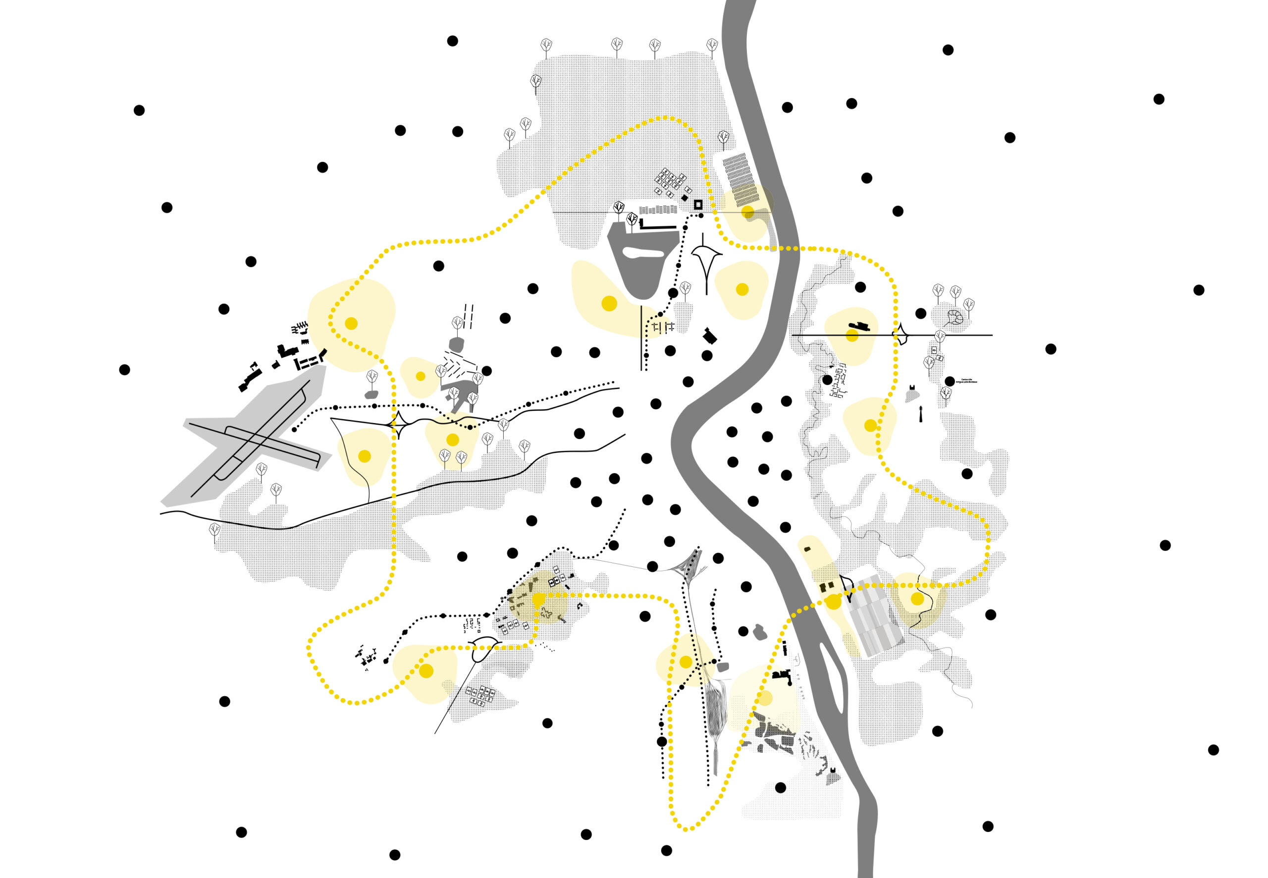 Dans notre proposition pour les Portes Métropolitaines de Bordeaux, nous avons proposé de dépasser « l’air de famille » pour se détacher de la figure de « la porte » qui pérennise l’organisation autour de la ville centre, au profit d’une « Métropole des pièces » qui reconnaît ces périmètres comme des polarités à part entière du système métropolitain. Mises en réseau, elles forment des constellations métropolitaines acentrées favorisant l’autonomie au sein d’un système cohérent.